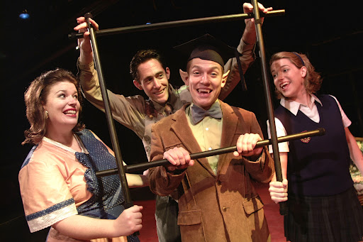 Miguel Cervantes (center) with (clockwise from left); Kerry A. Dowling, Michael Mendiola, and Sara Chase in the 2002 SpeakEasy Stage production of ” Bat Boy: The Musical.” The show was a turning point for the company.
