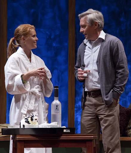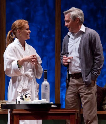| Claudia (Lesley Shires) and Noel (David Adkins) share some vodka and some secrets in “Homestead Crossing.” Photo: Meghan Moore |