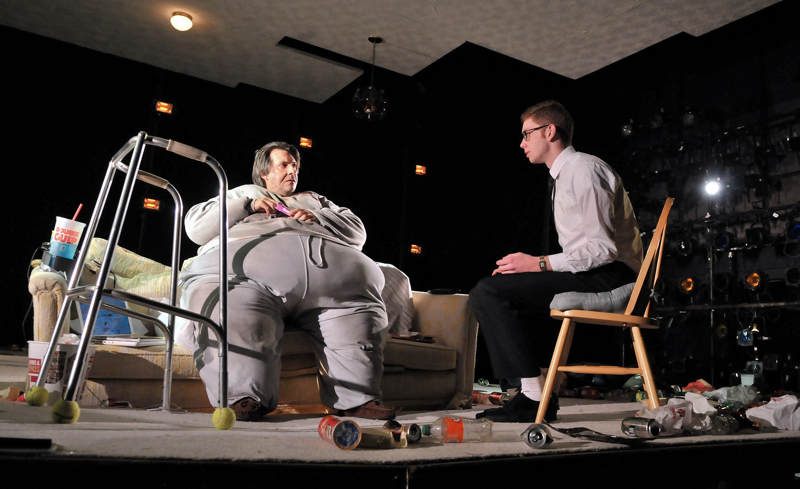 Costume designer Gail Astrid Buckley was able to rent the fat suit Kuntz wears from Playwrights Horizons, which performed the play, and prosthetics are used to bulk up his face and neck.