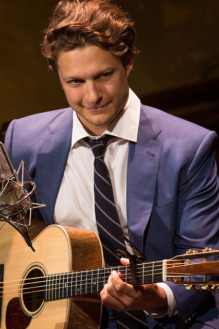 Scheuer uses six guitars during the performance in the tradition of the troubadour, with poetry or verse – or in this case stories — put to music. There are stories melded to each of the guitars and to different phases of Scheuer’s life, which is rather eventful for a performer who is still a young man.