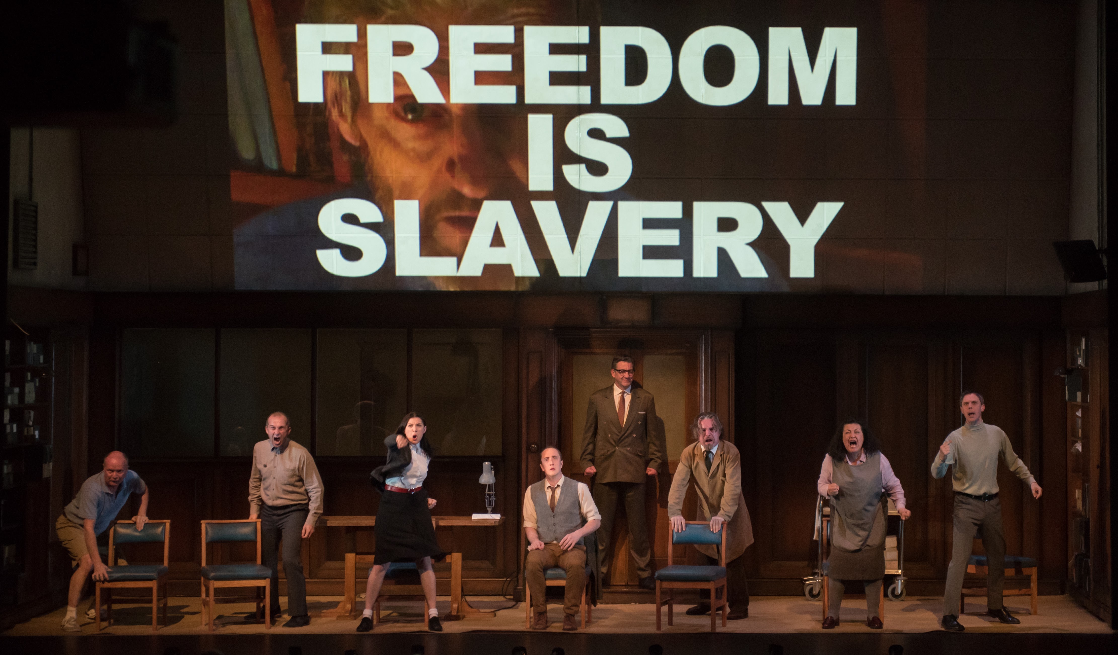 This production is lifted almost immeasurably by the superb work by the designers working under Icke and MacMillan, who also co-directed. Chloe Lamford’s set for the Victory Gardens is a bleak, forlorn building. The lighting and sound by Natasha Chivers and Tom Gibbons alternately stuns and startles, with throbbing strobe lights signifying changes in time while Tim Reid’s videos cast a sinister background, often evoking the Party slogans.