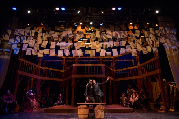 The Speakeasy Stage Company production of “Shakespeare in Love.” Adaptation by Lee Hall, based on the screenplay by Tom Stoppard and Marc Norman. Directed by Scott Edmiston. Scenic design by Jenna McFarland Lord. Original music, sound design and musical direction by David Reiffel. Choreography and period movement by Judith Chaffee. Costume design by Rachel Padula-Shufelt. Lighting design by Karen Perlow. Props design by Abby Shenker. Fight direction by Ted Hewlett. At the Calderwood Pavilion of the Boston Center for the Arts through Feb. 10. speakeasystage.com.