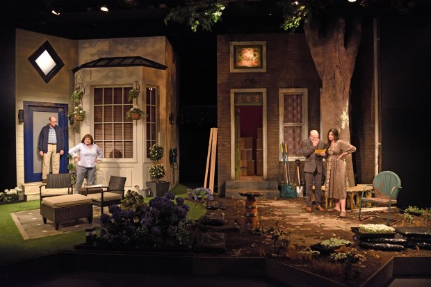 Left to right: Timothy Crowe as Frank, Anne Scurria as Virginia, Daniel Duque-Estrada as Pablo, Maria Gabriela Rosado Gonzalez as Tania in Native Gardens written by Karen Zacarias and directed by Christie Vela. Photo by Mark Turek
