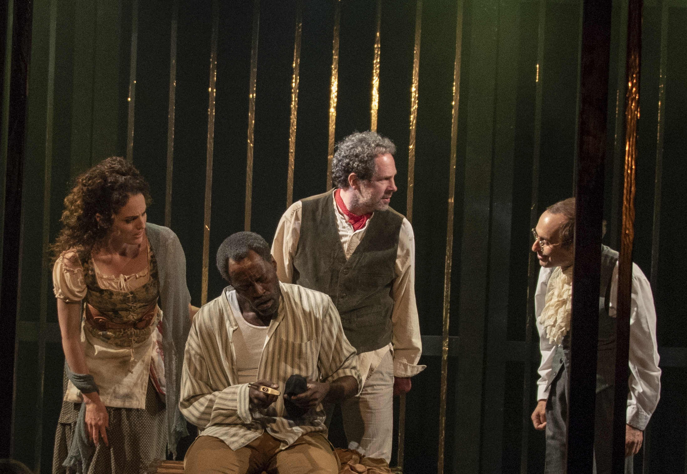 L to R: Therese Defarge: Jennifer Ellis; Doctor Manette: Rob Karma Robinson; Ernest Defarge: Benjamin Evett; Mr. Lorry: John Shuman. Photo: Kippy Goldfarb, Carolle Photography