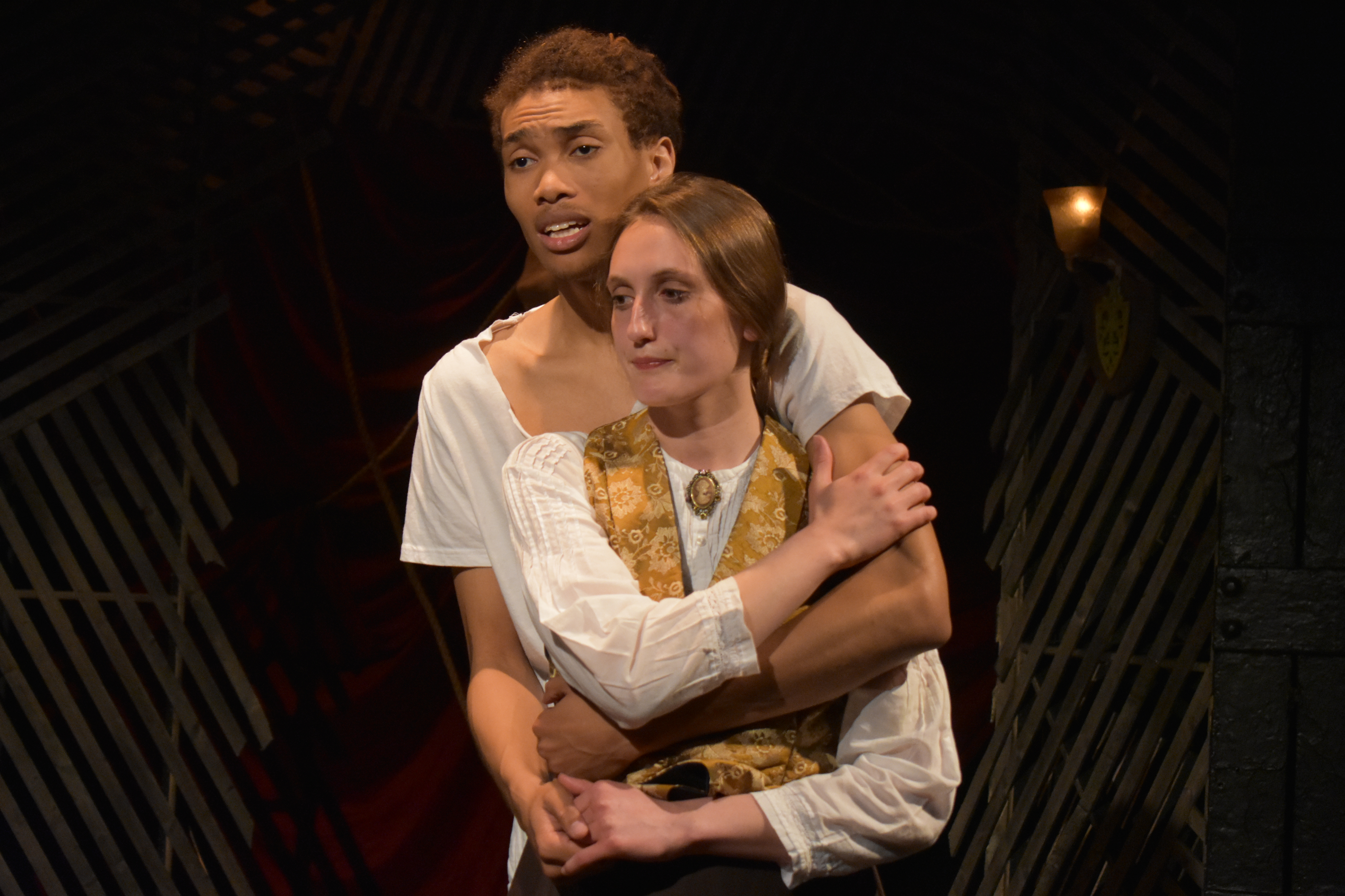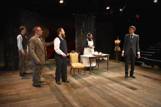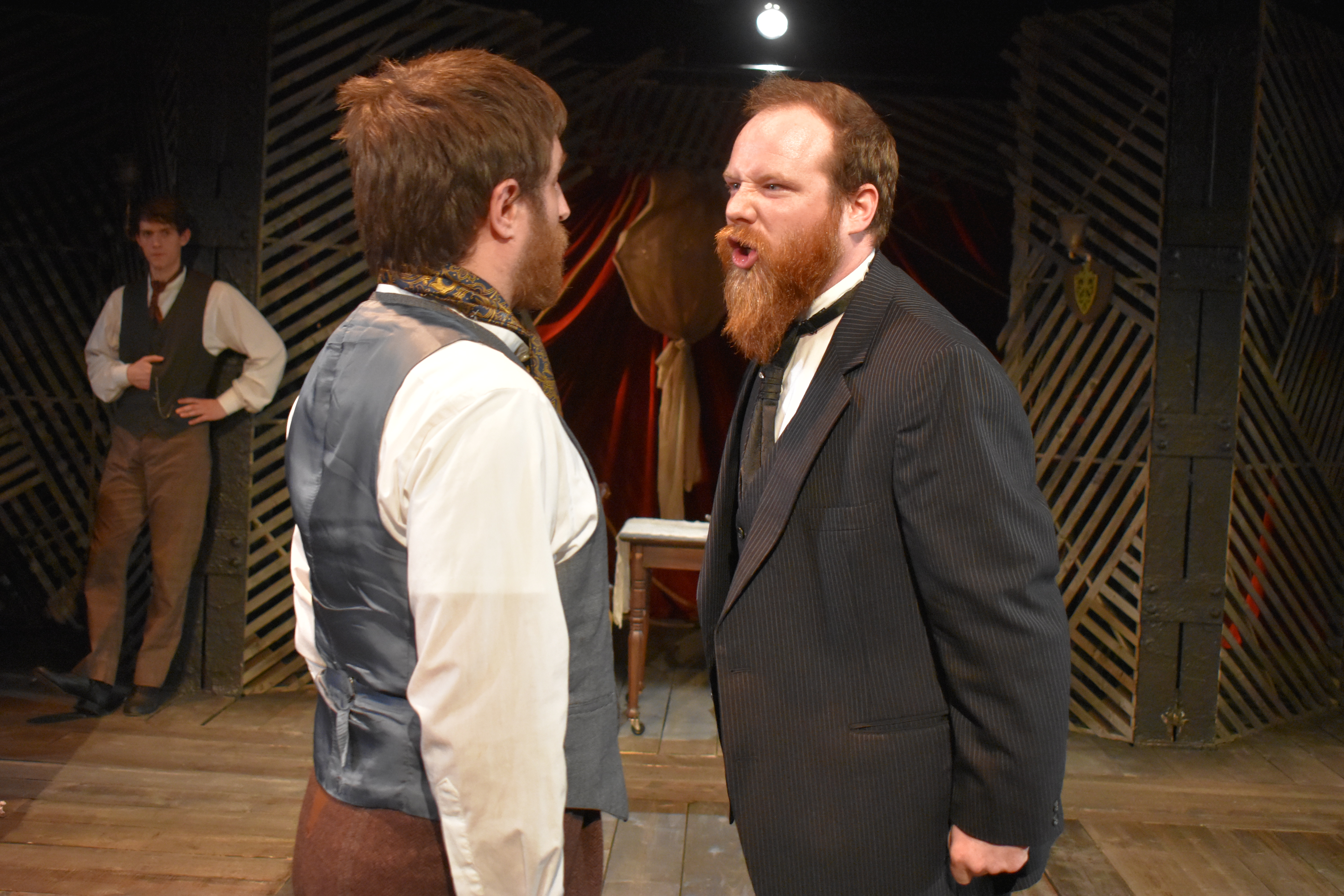 James J. Fenton, recently IRNE-nominated for his work on Merrimack Rep’s “Silent Sky” has festooned the theaters in the play with playbills from the 1833 engagement, gas lights and the red velvet in question. Alexander Fetchko’s evocative lighting with its dimly-lit areas and shadows complements Becca Jewett’s costumes, which are period perfect without suffocating the actors.