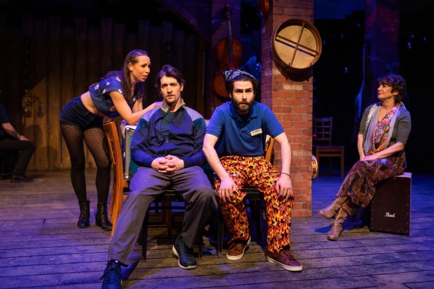From the left, Marta Ryner, Chris Coffey, Jacob Brandt and Kathy St. George watch TV in “Once.” Photo: Maggie Hall Photography