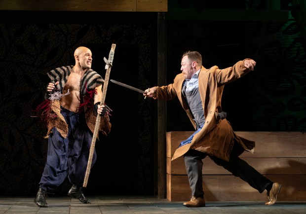 He shines in his “Do you know who I am?” moment, his fatal duel with Guiderius (Jonathan Higginbotham), who just happens to be the long-lost son of the King Cymbeline and the actual heir to the throne.