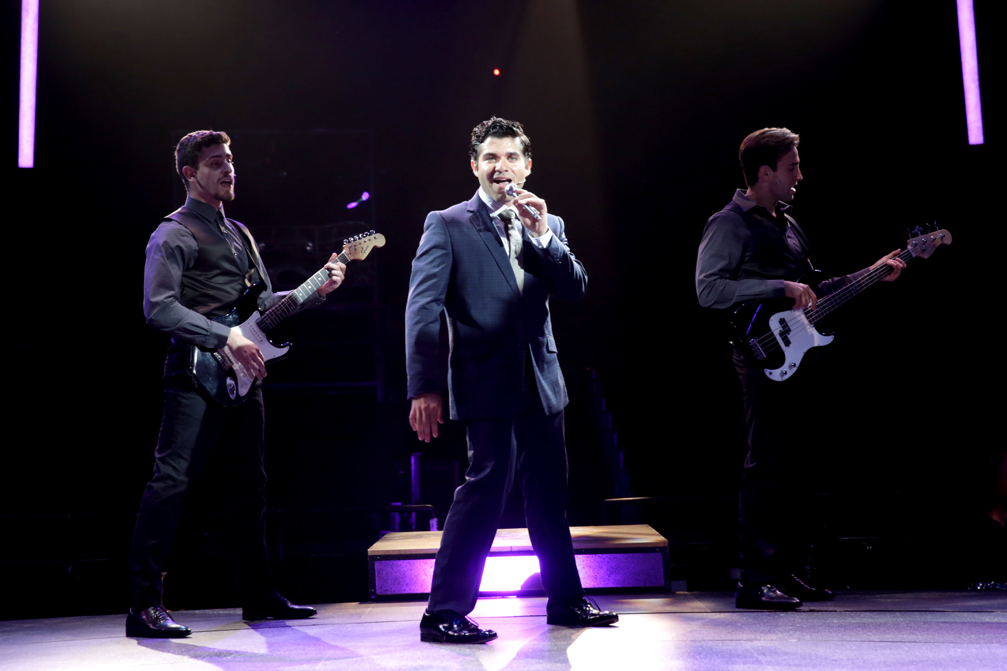 Jonathan Mousset Alonso (Frankie Valli) with Michael Allan Haggerty and Corey Mosello in JERSEY BOYS, playing at North Shore Music Theatre thru September 1. Photo by Paul Lyden
