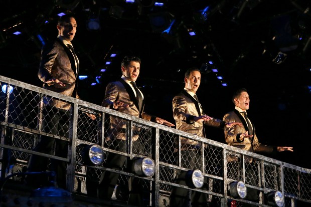 The North Shore Music Theatre production of “Jersey Boys. Original Broadway Stage Production by Dodger Theatricals. Book by Marshall Brickman & Rick Elice. Music by Bob Gaudio Lyrics by Bob Crewe. Director & Choreographer: Kevin P. Hill. Set design: Kyle Dixon. Costume design: Dana Pinkston. Lighting design: Jose Santiago. Sound design Daryl Bornstein. Hair and wig design: Rachel Padula-Shufelt. Music Director: Milton Granger. At the North Shore Music Theatre through Sept. 1. nsmt.org.