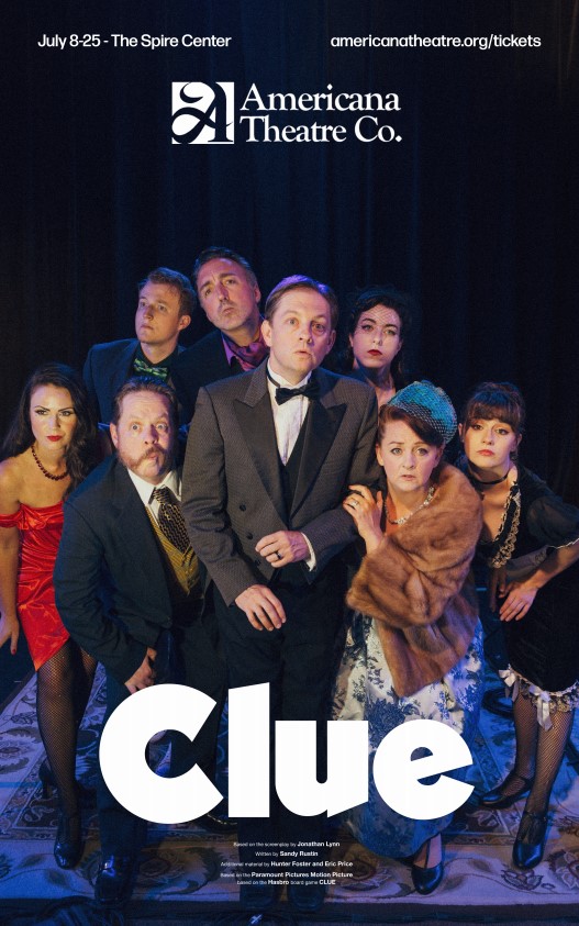 The Americana Theatre Company Production of “Clue.” Adapted from the screenplay by Jonathan Lynn, with additional materials by Hunter Foster, Eric Price and Sandy Rustin, adapted from the Paramount Pictures film, inspired by the Hasbro, Inc. board game. Directed by Eric Harrell. Stage management by Ciera Mille. Set design by Derek Martin. Lighting design by Heather M. Crocker. At the Spire Center for the Performing Arts, 251/2 Court St., Plymouth through July 25. For tickets or more information, go to americanatheatre.org/tickets, or call 508-591-0282.