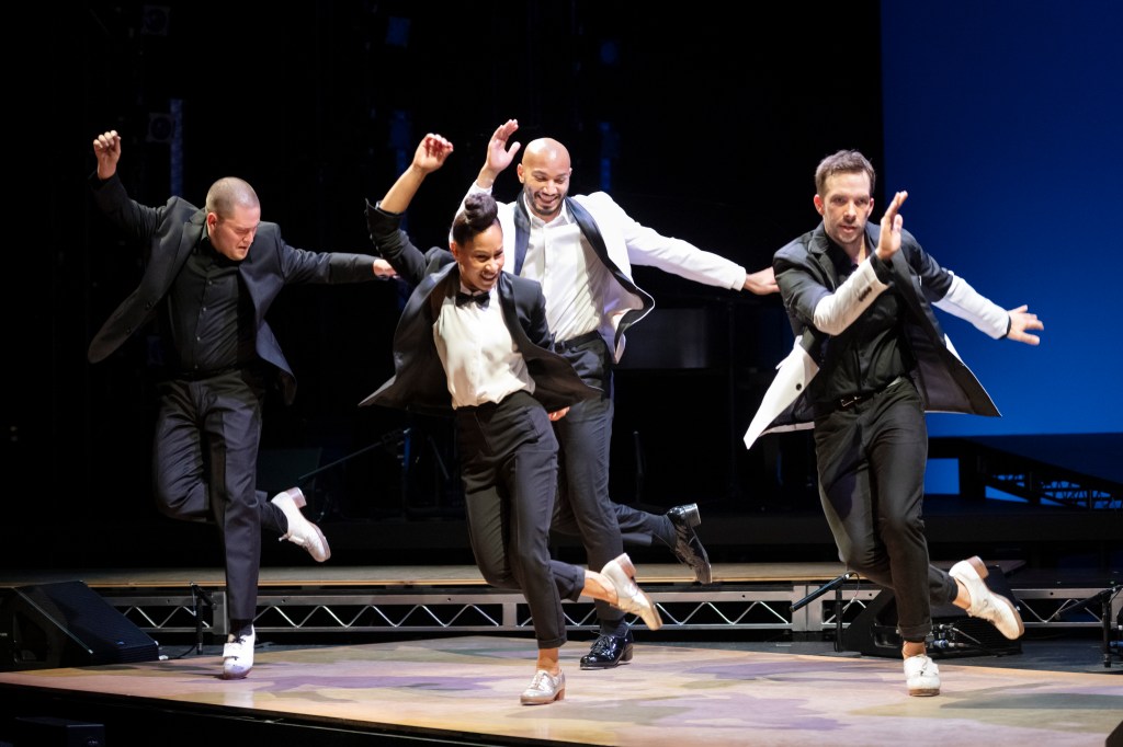 And while Casel gives her cast of dancers, stars in their own right — Amanda Castro, Naomi Funaki, John Manzari, Anthony Morigerato, and Kurt Csolak — plenty of space to strut their own stuff, they often also join as one in a noisy, joyous collaboration of precision tapping. The audience, most of whom were attending their first live theatrical production in 18 months, roared.