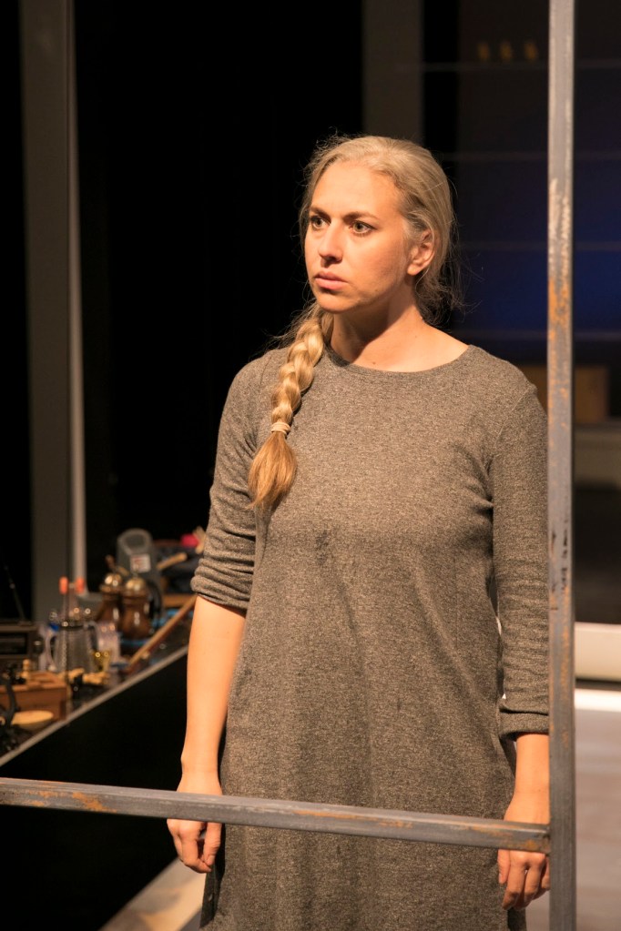 Four-time IRNE and Norton Award-winning set designer Janie E. Howland Howland has fashioned a versatile set that includes a series of metal frames, benches, shelves and chairs that move quickly and easily quickly to become tables, beds, and whatever else is needed.