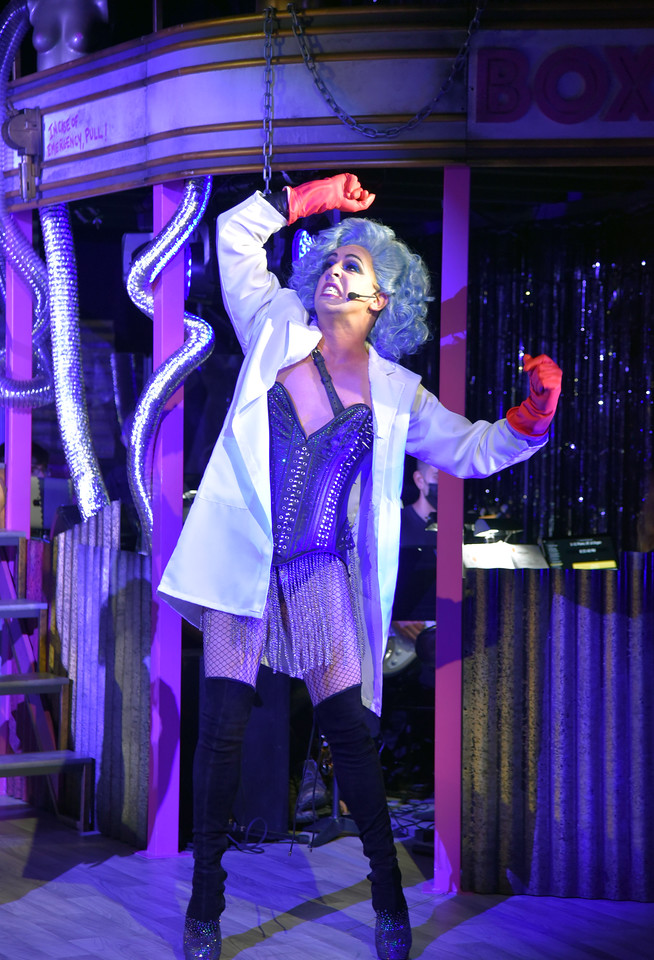 Mill’s mad doctor is less physically threatening than your usual horror villain, but he has dialed up the campy, creepy, decadent side of the character, as if it needed any ramping up. He’s a sight in a fright wig, bustier and thing-high black boots, and he commands the stage no matter what he’s up to, and especially with a chainsaw in his hands.
