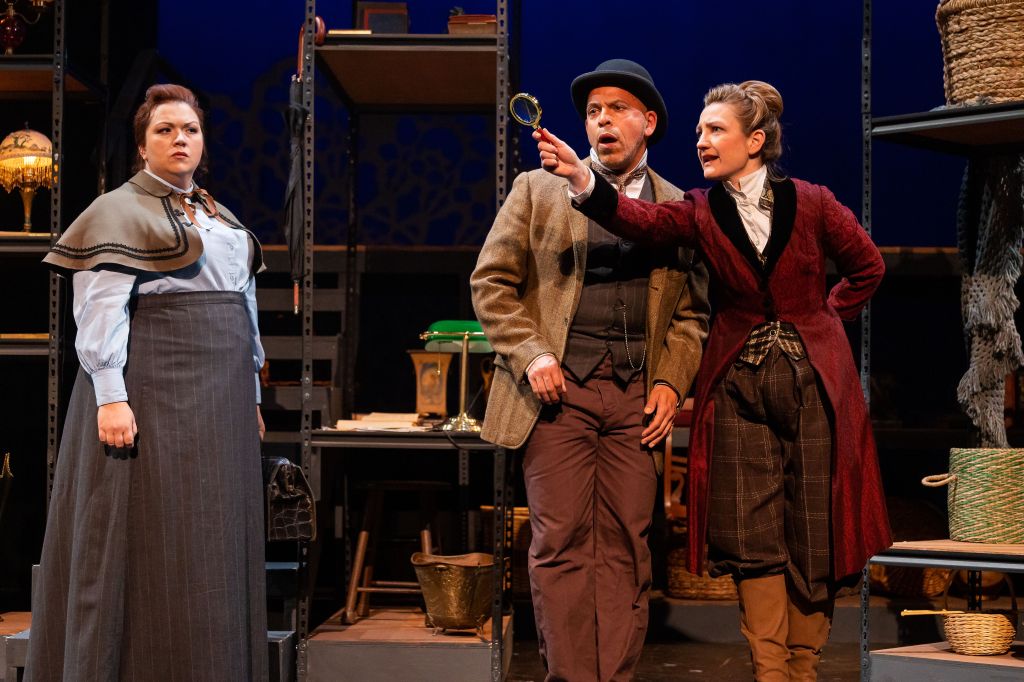 There’s David Remedios’ mood-setting sound design that reminds us of a dark and deep place where something bad could happen at any moment; Deidre McCabe Gerrard’s grand Victorian costumes, especially her stylish duds for Miss Holmes; Katy Monthei’s detailed and well-conceived set, with plenty of dark corners; and Corey Whitmore’s lighting, which shifts gears abruptly to follow the plot’s twist and turns.