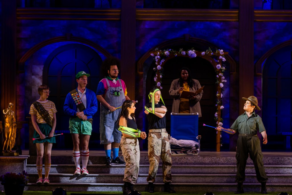 Doyle’s work is part of Maler’s longtime tradition – here continued by Director Megan Sandberg-Zakian — of making sure production values such as sound, lighting, costumes, and set are bold and brassy enough to be seen and appreciated by all in the audience, and impervious to the sirens, church bells, etc. endemic to outdoor productions.