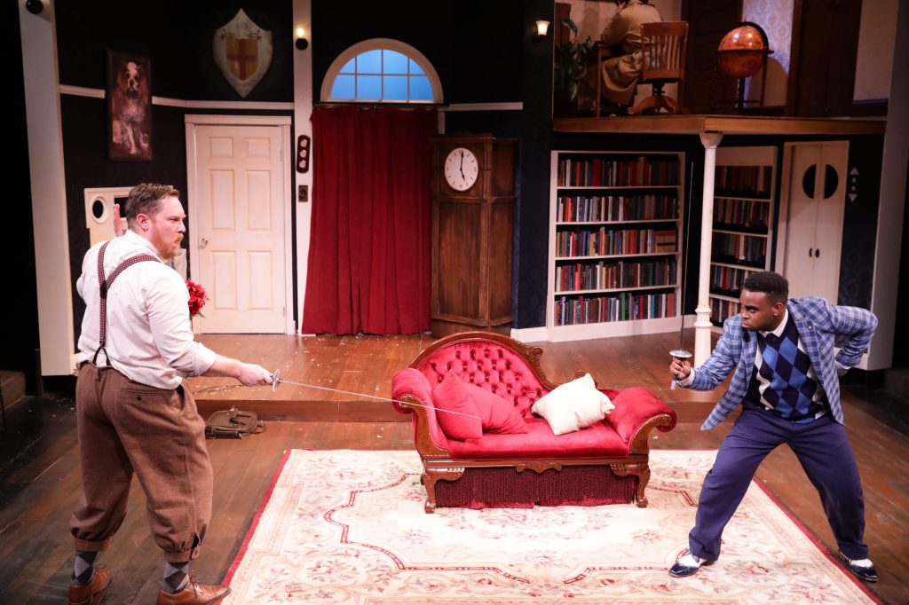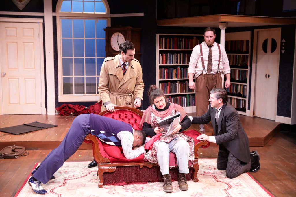 As the play within the play opens, a murder has been committed, and soon the corpse of murder victim Charles Haversham (Dan Garcia) – killed during his own engagement party in the drawing room – will be moving voluntarily and involuntarily in a hilarious variety of ways.