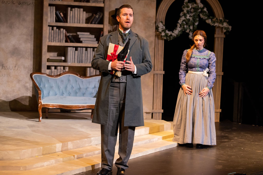 His grandson Laurie (Kenny Lee) is clever and charming and becomes the missing son and brother of the family. Laurie’s tutor, Mr. Brooke (Michael Jennings Mahoney) is poor but earnest and kind, which Meg immediately notices. Kevin Patrick Martin shines as Professor Bhaer, a German tutor and friend of Jo who becomes something more, threatening Jo’s vow to “never marry.”