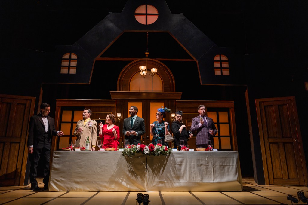 There are twists and turns aplenty in the plot and there’s even a nod to the board game’s trapdoor. Katy Monthei is scenic designer and oversees a clever. intricate set that includes scenery built by the Ogunquit Playhouse Scene Shop. A revolving set piece allows rooms and scenes to be switched from the lounge to the billiard room in just seconds, and the set works in concert with Jeff Adelberg’s lighting. sound design by Caroline Eng+, and the colorful costumes by Deidre Gerrard to create the desired atmosphere while remaining true to the spirit of the board game. Production Stage Manager Shauwna Dias Grillo has her hands full making sure the train stays on the tracks.
