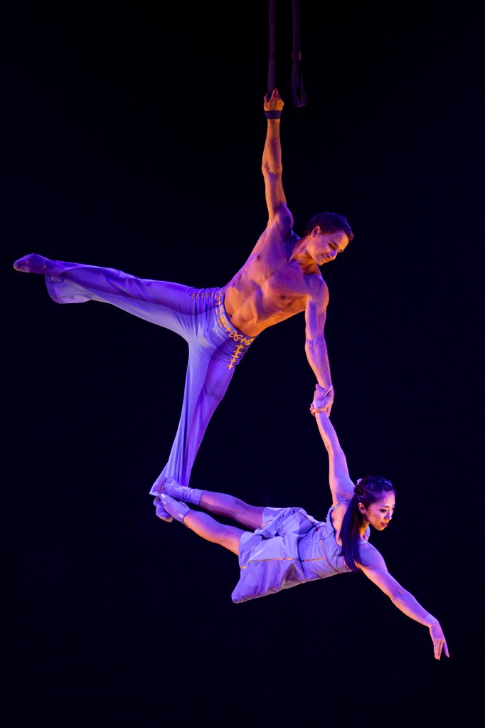 The soaring vocalists and live band, dressed as Pierrots, are scattered around the stage, and there’s world-class work by the violinist and percussionist, to name just two. Sound design is another area where Cirque has always excelled.