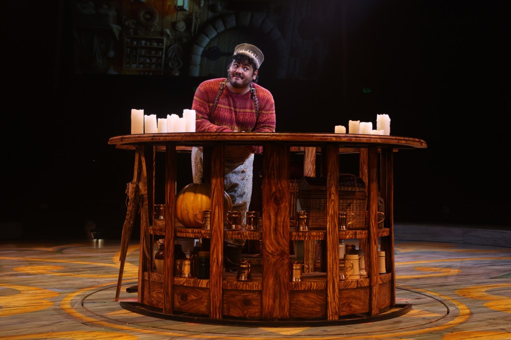 NSMT Artistic Director Kevin P. Hill, who directs and choreographs, has long since mastered the intricacies of choreographing production numbers in the in-the-round configuration, and they are a delight. The best is the rousing, joyous Act II opening number “Hygge,” with Michael Schimmele’s fine comic turn as Oaken, the proprietor of a quirky trading post in the mountains, where men and women emerge from a sauna to perform a peek-a-boo chorus line.