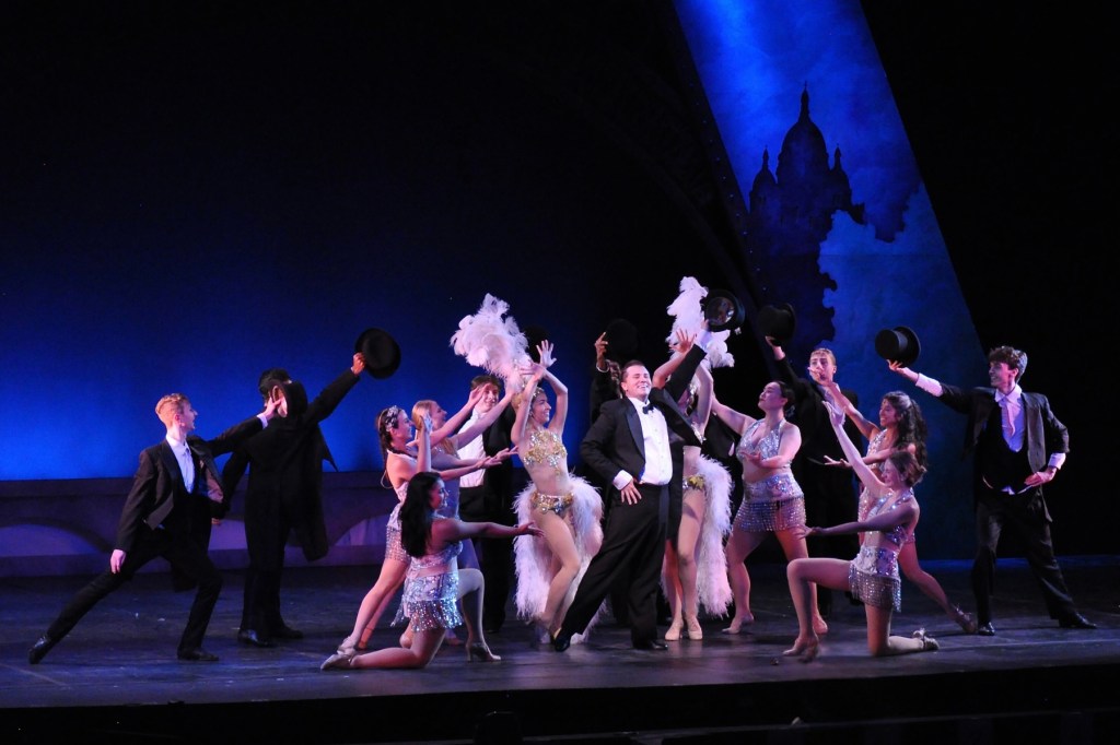 Reagle has pulled out all the stops in staging the work. There is a cast of 32, including swings, and an orchestra led by Dan Rodriguez with 20 pieces that does full justice to the score. The other various production values – effective scenic design by Cameron McEachern, including an Eiffel Tower backdrop under a starlit sky – Franklin Meissner Jr.’s lighting, costumes by Johnny Cagno and Brian Simons of Emerald City Theatrical, sound by Sebastian Nixon — all contribute to the success of the production.