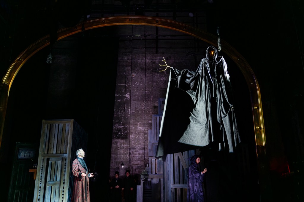 There are harrowing scenes that harken to the depths of human misery. Street vendors selling every manner of goods crowd the street … simply to eke out a living and stay alive for another day. Later, the dirt-poor Mrs. Cratchit (Tamara Ryan) howls with grief and is inconsolable at the unnecessary death of her Tiny Tim (Paul Jagger Karger). And the young actors playing Want (Cora Hertz ) and Ignorance (Eviva Rose) cower at the feet of Carolyn Saxon as The Ghost of Christmas Present, horrifying even Scrooge.